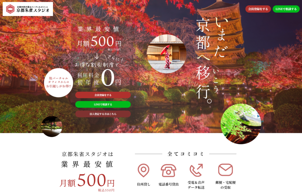 京都朱雀スタジオは、京都市内の信頼性ある住所を利用できるバーチャルオフィスです。法人登記にも対応しており、個人事業主から法人設立予定者まで幅広く支持されています。