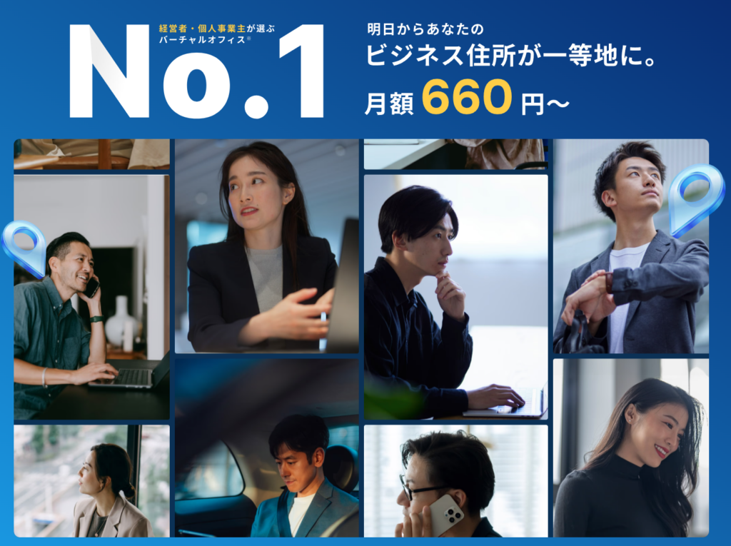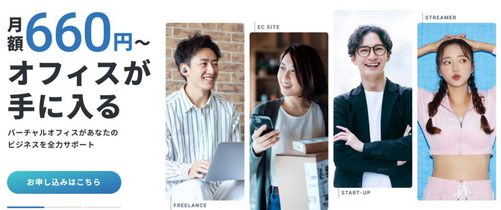 最大の特徴は、月額660円から利用できる圧倒的な低価格プラン。とにかく初期コストを抑えたい個人事業主には非常に魅力的です。一方で、登記利用や郵便転送の頻度によっては追加費用が発生するため、プラン内容の確認は必須です。
