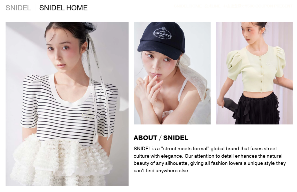 SNIDELは、日本発の人気レディースファッションブランドで、フェミニンなデザインとトレンド感を兼ね備えたアイテムが特徴です。女性らしいシルエットのワンピースやスカートが人気で、きれいめカジュアルからフェミニンスタイルまで幅広いコーディネートを楽しめます。
