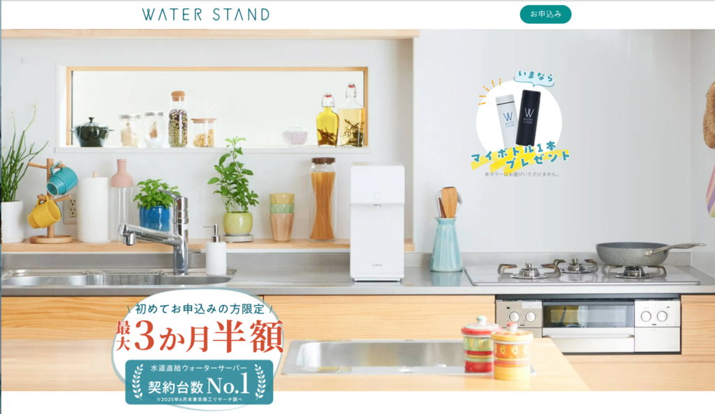 中でも、定額で使い放題・ボトル交換不要という手軽さから、多くのママに選ばれているのがウォータースタンドです。