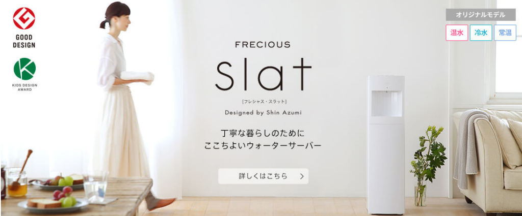 フレシャスは軽量パック型のウォーターサーバーで、女性でも扱いやすい設計が特徴です。デザイン性も高く、使いやすさに配慮されています。