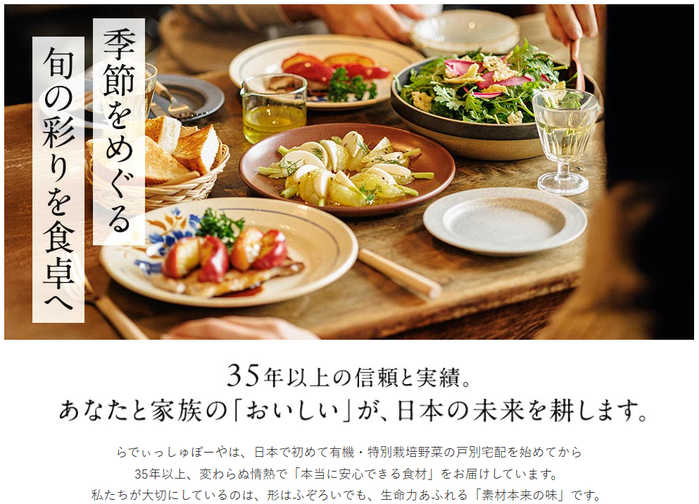 らでぃっしゅぼーやは、有機・低農薬野菜に特化した食材宅配サービスで、特に健康志向の高い家庭に支持されています。厳しい独自基準をクリアした野菜のみを取り扱っており、食の安全性を最優先に考える方に適しています。