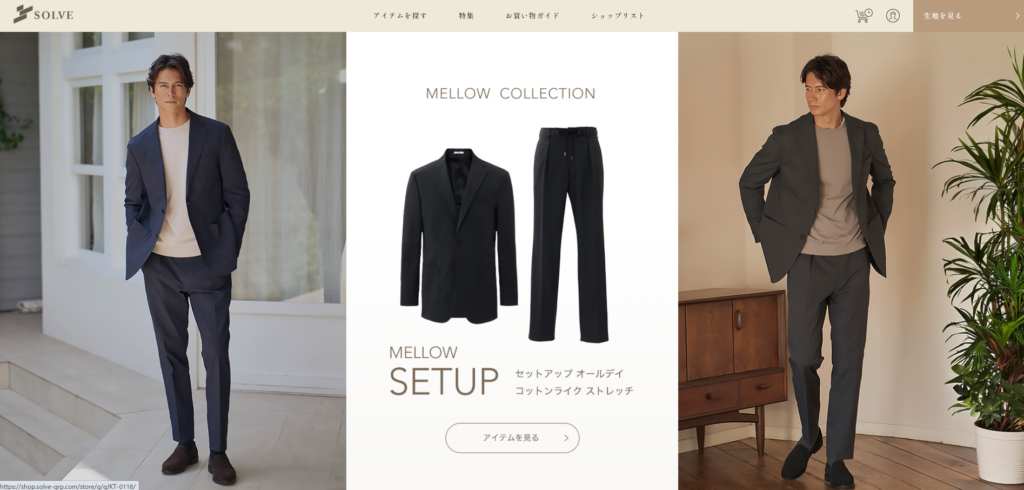 SOLVEは、忙しいビジネスマンのために設計されたメンズファッション通販ブランドです。最大の特徴は、**“考えなくても清潔感のあるコーデが完成する設計”**にあります。