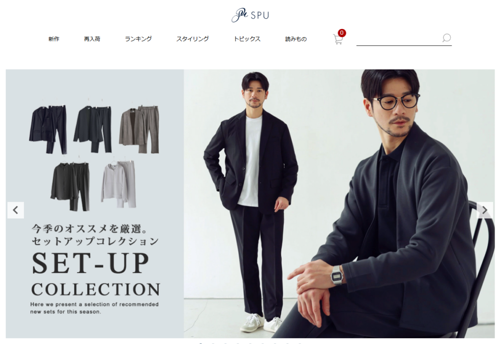 SPUは、シンプルかつ清潔感のある「きれいめカジュアル」を得意とするメンズファッション通販ブランドです。特に特徴的なのが、コーディネートセットの充実度で、上下セットや季節ごとのおすすめスタイルをそのまま購入できる点にあります。