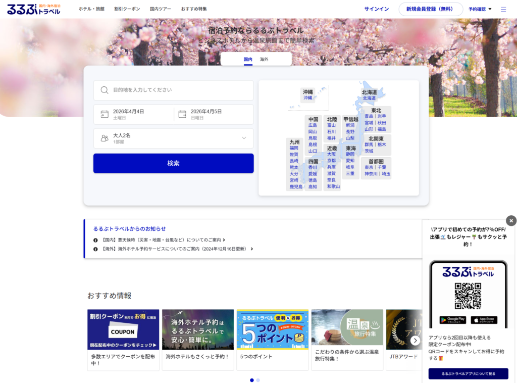 るるぶトラベルは、JTBグループが運営する信頼性の高い宿泊予約サイトです。長年の旅行業界での実績があり、「安心して利用できるサイト」を求める方に向いています。