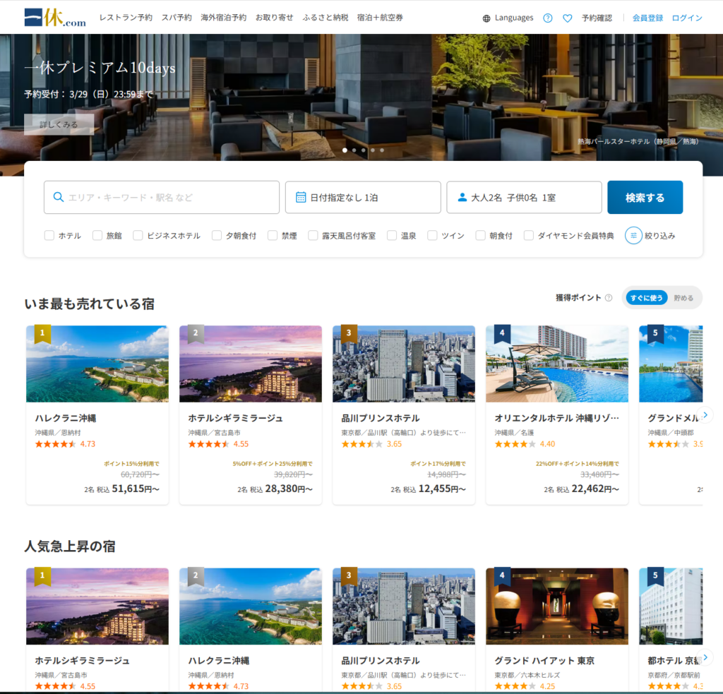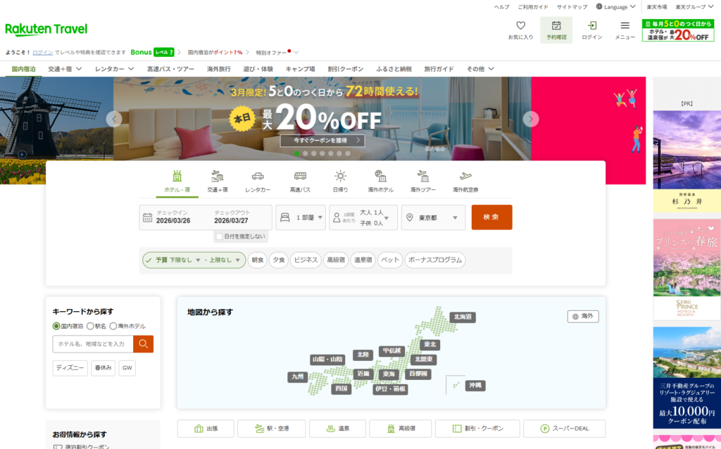 楽天トラベルは、日本最大級の宿泊予約サイトの一つで、掲載施設数の多さと楽天ポイントの利便性が大きな魅力です。特に楽天市場や楽天カードを利用しているユーザーにとっては、ポイントを効率よく貯めて使えるため、実質的な宿泊費を抑えることができます。