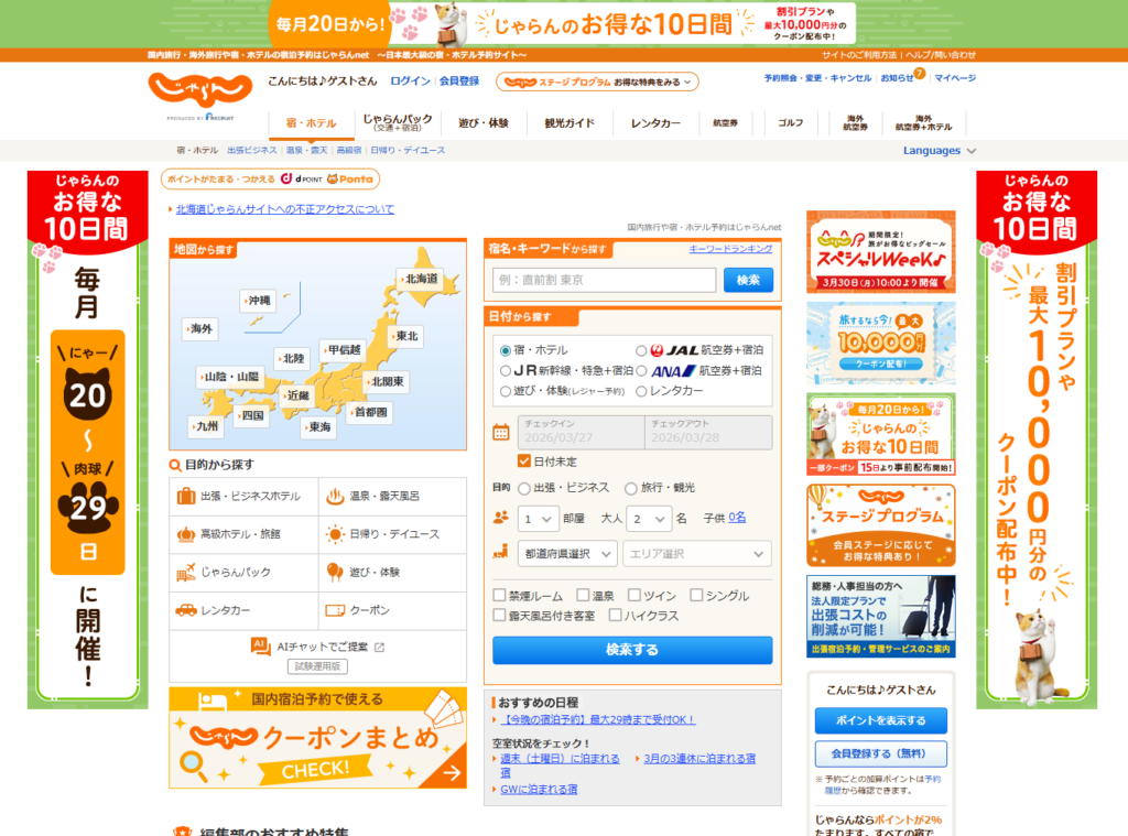 また、特集ページやテーマ別の宿紹介が充実しているため、「温泉旅行」「カップル向け」「記念日旅行」など、目的に応じて探しやすい設計になっています。さらに、Pontaポイントやリクルートポイントが利用できる点も魅力です。