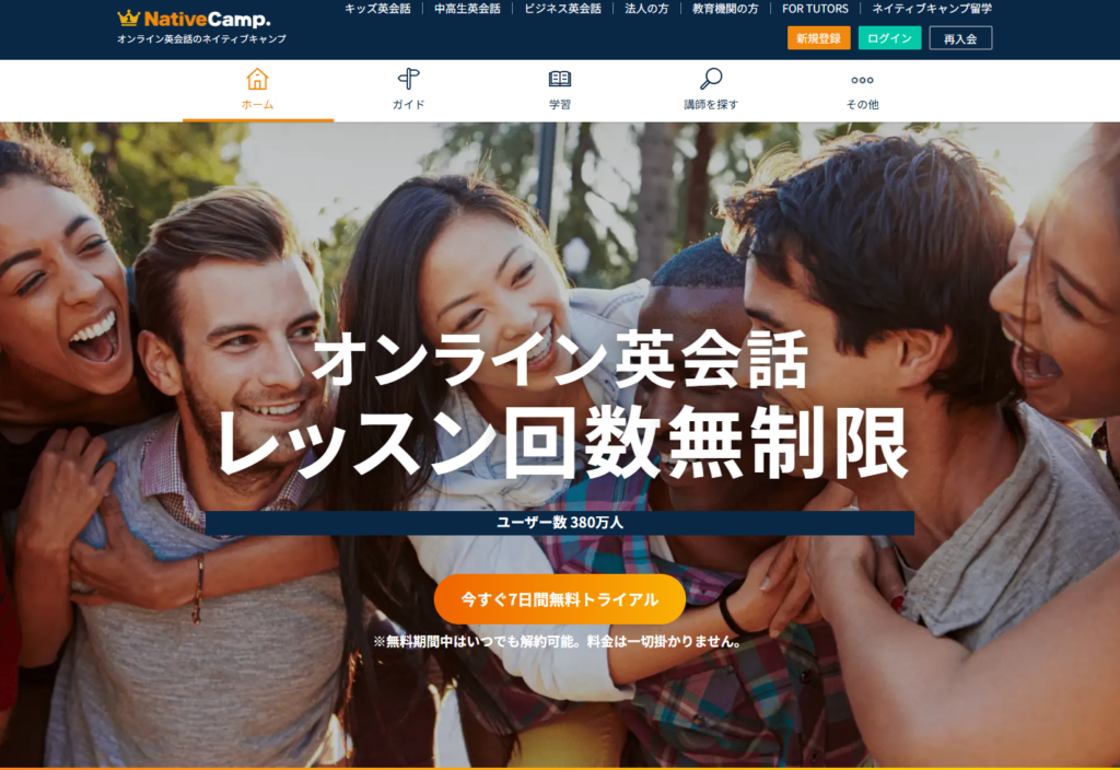 ネイティブキャンプは、月額定額でレッスン回数が無制限という特徴を持つオンライン英会話サービスです。世界130カ国以上の講師と、好きなタイミングで英会話レッスンを受けることができ、実践的なスピーキング力を伸ばしたい方に向いています。