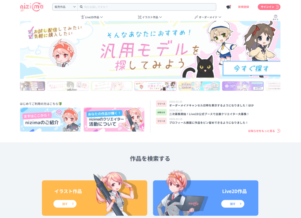nizimaは、Live2D社が公式に運営するマーケットであり、VTuber用Live2Dモデルを安心して購入・販売・依頼できるプラットフォームです。最大の特徴は、完成済みのモデルをその場で動かして確認できる高性能プレビュー機能で、購入前にクオリティをしっかりチェックできます。