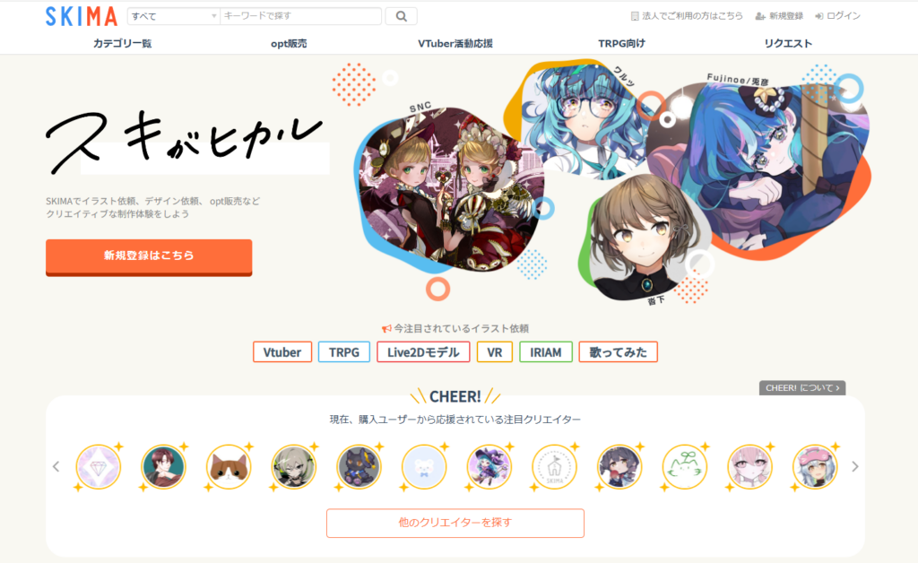 SKIMAは、イラストやLive2Dモデル制作をクリエイターに直接依頼できるスキルマーケットです。完全オーダーメイド形式のため、自分だけのオリジナルVTuberモデルを作成できるのが最大の魅力です。
