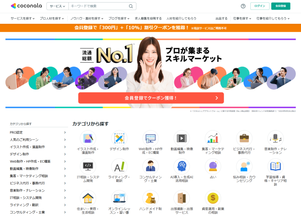 | ココナラ | 無料登録 | 5,000円〜50万円 | △ | ◎ | 初回クーポン | 案件数が圧倒的 |