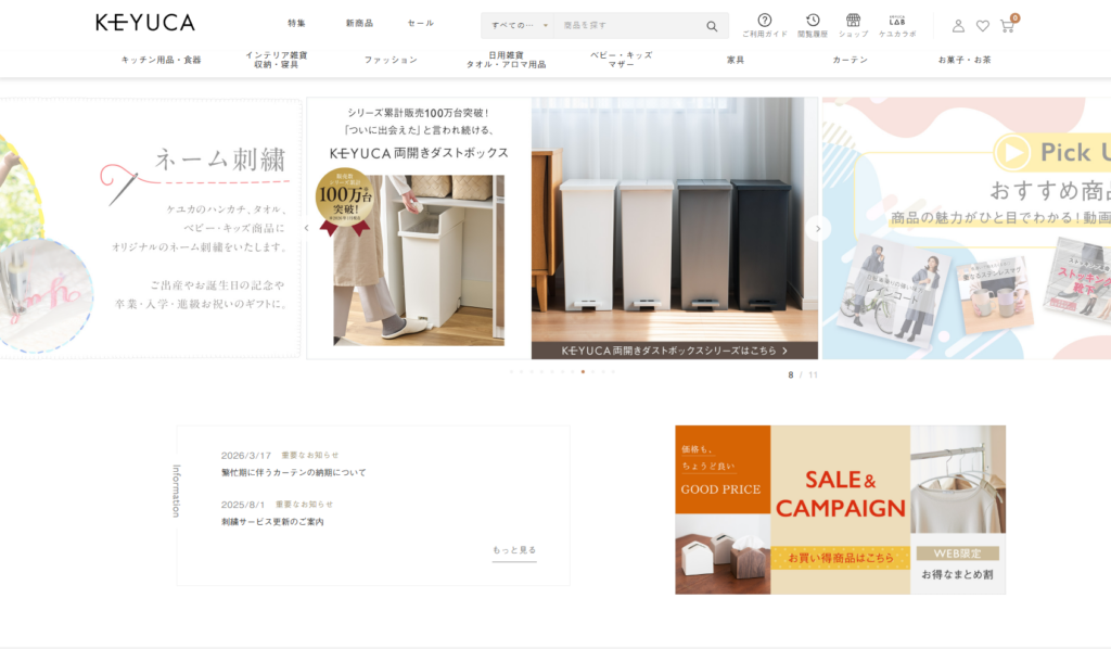 KEYUCA(ケユカ)は、「ちょうど良いをつくる」をコンセプトに、シンプルで機能的な生活雑貨を展開する人気ブランドです。キッチン用品・収納グッズ・インテリア雑貨・ファッション小物・家具・カーテンまで幅広く取り扱っており、生活に必要なアイテムを一つのブランドで揃えられるのが大きな魅力です。