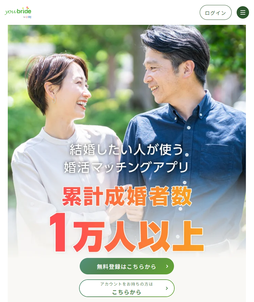 ユーブライドは、結婚相談所で有名なIBJグループが運営する婚活サービスで、累計成婚者数が多い実績を誇る信頼性の高いアプリです。特に30代〜40代の真剣な婚活ユーザーが多く、再婚希望者も一定数存在しているため、落ち着いた出会いを求める女性に向いています。