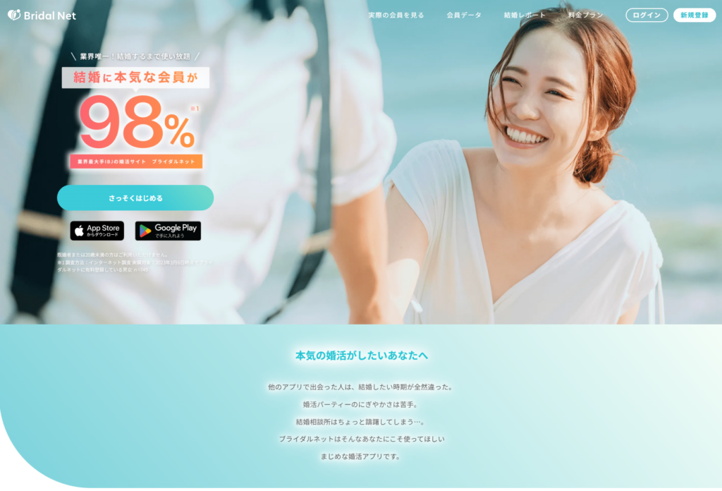 ブライダルネットは、結婚相談所IBJが提供するオンライン婚活サービスで、「サポート付き婚活」が特徴のアプリです。専任カウンセラー(婚シェル)がつき、プロフィール作成や活動のアドバイスを受けられるため、婚活に不安がある方でも安心して進めることができます。