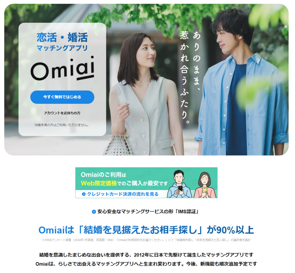 Omiaiは、真剣な恋愛から結婚を見据えた出会いを提供するマッチングアプリとして、長年高い人気を維持しているサービスです。会員の中心は20代後半〜30代ですが、結婚を意識したユーザーが多く、再婚希望者も一定数活動しています。